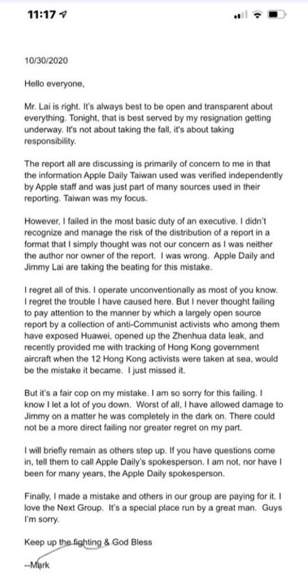 Mark Simon30日深夜在個人twitter上承認涉事,並就事件致歉及宣布辭職(Tonight, that is best served by my resignation getting underway)。他聲稱對事件感到後悔,但重申自己很多年前已不是《蘋果日報》發言人。