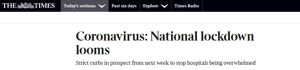 《泰晤士報》引述政府高級人員說,約翰遜可能會於周一舉行記者會,公布第二度頒布全國性封鎖令的詳情。預料新措施生效後,除了提供必需性服務的商店及教育機構和設施外,其餘都要關閉。