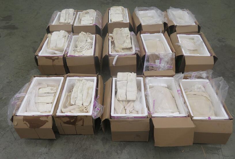 海關人員27日透過風險評估,檢查一批從墨西哥抵港,報稱載有急凍魷魚的空運貨物。經檢查後,海關人員在其中9個發泡膠箱內發現該批懷疑受管制加利福尼亞灣鮮石首魚魚肚,與急凍魷魚混雜一起。