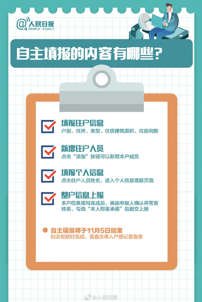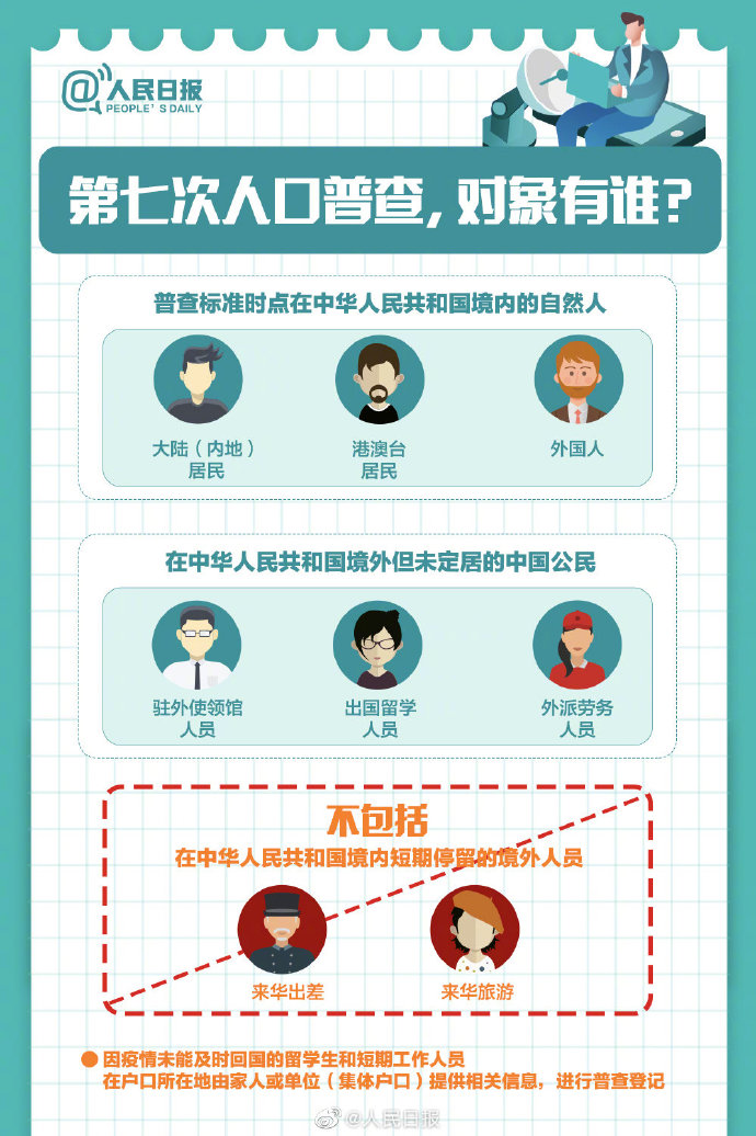 第七次全國人口普查登記於11月1日開始,700多萬人口普查員今起上門登記#。本次人口普查將採取電子化方式開展普查登記,同時倡導普查對象自主填報個人和家庭信息。哪些人是人口普查對象?如何進行自主填報?人民日報製作圖表一一詳解。