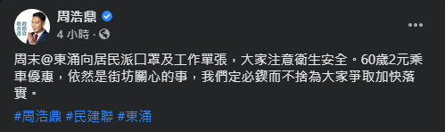 民建聯立法會議員周浩鼎在社交平台表示,他於周末在東涌派口罩與工作單張,呼籲居民注意衛生安全。周浩鼎指過程中得悉居民依然關心60歲2元乘車優惠,而他表示民建聯會鍥而不捨為市民爭取加快落實優惠。