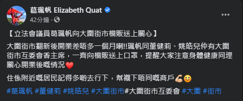 民建聯立法會議員葛珮帆在社交平台表示,早前與前區議員董健莉、沙田社區幹事姚皓兒和大圍街市互委會香主席,一同向大圍街市檔販送口罩,提醒他們注意身體健康。