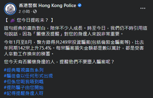 警方在社交平台表示,今年1至8月共錄得包括倫敦金騙案在內的249宗投資騙案,而每宗案件都涉及數以萬計的金額。而警方則配合防騙吉祥物「提子」去改寫廣告台詞——「你今日提咗未?」去呼籲市民關懷身邊人,並要提醒身邊人他們不要墮入騙案。(記者 唐信恒)