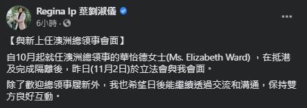 澳洲駐港總領事一職今年2月起懸空,直至10月2日才由華怡德(Ms. Elizabeth Ward)接任。新民黨主席葉劉淑儀3日在社交平台表示,昨日(2日)與華怡德於立法會會面,她歡迎對方履新並希望日後能繼續透過交流和溝通去保持雙方的良好互動。