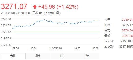 11月3日,星期二,農曆九月十八。受隔夜美股大漲影響,今日A股三大指數集體高開。上證指數最高漲幅超過1.5%,臨近午盤,三大指數均小幅回落調整。午後,三大指數延續震蕩盤升態勢,三大指數漲幅均超過1%,其中,創業板指漲幅一度擴大至1.5%。板塊方面,權重板塊集體走強,白酒板塊大爆發,有色、第三代半導體等漲幅居前,燃料電池、銀行股先後拉升,燃料電池、免稅店、5G等異動拉升。
