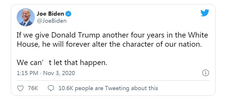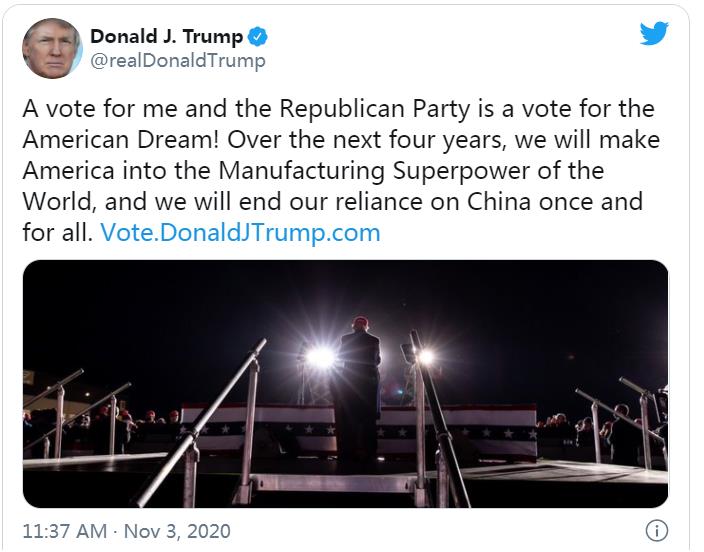 當地時間3日,特朗普在Twitter發文稱,投票給他是投給「美國夢」,又稱美國將結束對中國的依賴。拜登則在Twitter發文稱,若然再讓特朗普主政四年,他將永遠改變美國的「個性」。
