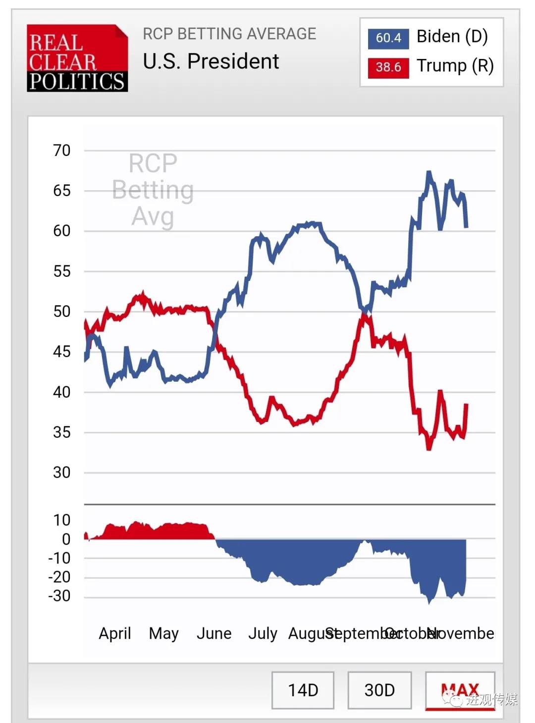 3. 全球博彩賠率一直站在拜登一邊。按截至今天中午的全球博彩公司最新賠率,雖然特朗普的熱度有所回升,但拜登勝出的賠率仍明顯低於特朗普。其中一家公司的賠率略有變化: 拜登由1.44倍調高至1.53倍;特朗普的賠率由2.65倍調高至2.5倍(注: 賠率越高,表明獲勝的概率越低)。其餘幾家公司的賠率基本保持不變,特朗普都是低概率。