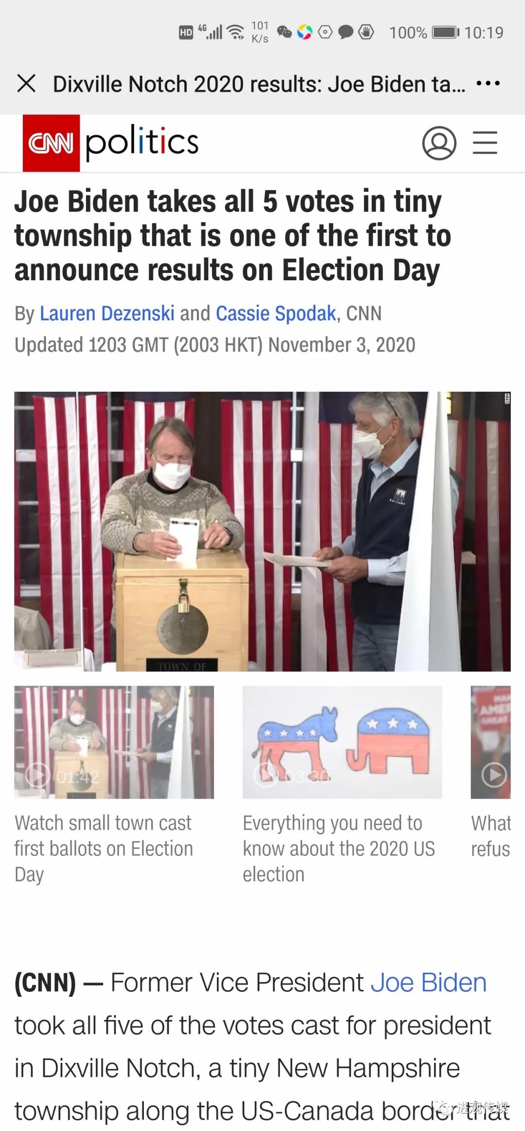 當然究竟最後鹿死誰手,仍很難說。只是從目前看,拜登的勝算很大。順便說一下,就在此時,美國新汗布夏州北部一個小鎮的投票結果已率先出爐,拜登勝, 雖然無足輕重。
