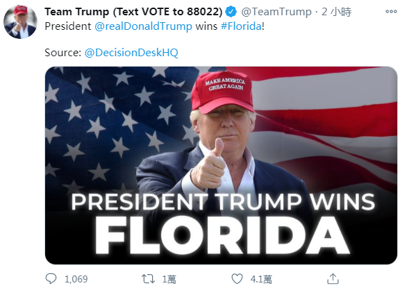 [12:15]美國總統特朗普的競選團隊宣稱已拿下關鍵州佛羅里達,該州選舉人票多達29票。其中,《華盛頓郵報》成為第一家稱特朗普已拿下佛羅里達的主要媒體。