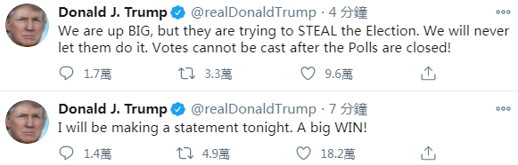 [23:05]特朗普在Twitter表示,他昨晚在許多關鍵州份都領先,而且幾乎都是民主黨管理及控制的地方。他指,有關優勢開始魔術般地消失,原因是那些堆存的選票被清點。他形容此事非常奇怪,又指民調專家完全搞錯了。