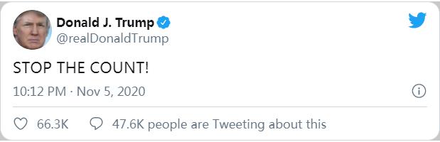 「我們相信美國人民理應完全透明地知情全部選票計點和選舉審核,而這已經不僅僅關係到某一個選舉。這關係到我們整個選舉程序的合法性。我們從一開始就指出,所有合法選票必須點計,而所有非法選票不應點計。然而,我們在這樣基本的原則問題上都處處受到民主黨人的抵制。我們將依據各項法律堅持申索,以確保美國人民對我們政府的信心。我永遠不會放棄為國為民的鬥爭。」