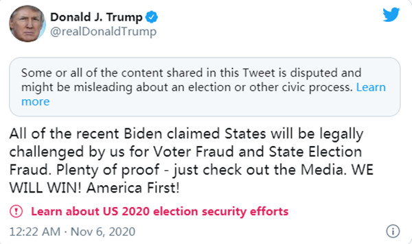 拜登勝選的消息傳出後,特朗普拒承認落敗,稱會在11月9日展開法律行動挑戰選舉結果,揚言選戰仍未完結。