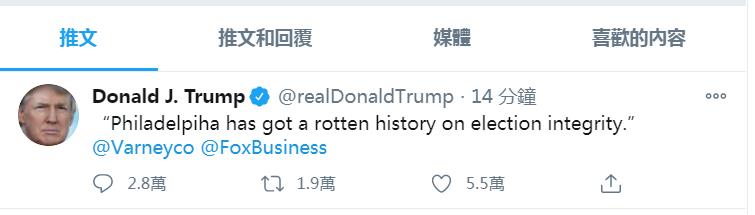 [23:08]特朗普发布推特称:“费城(宾州最大城市)在选举上有历史污点。”