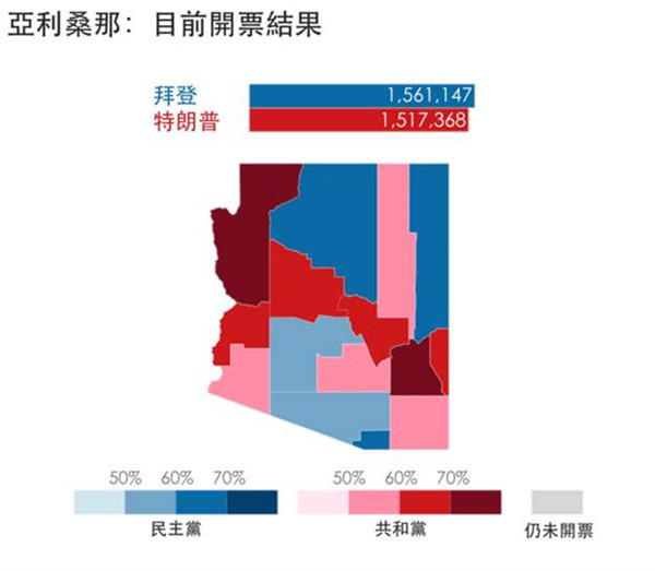 [15:55]亞利桑那州「翻藍」!拜登拿下該州11張選舉人票,成為自1948年來第二位拿下共和黨這個票倉的民主黨總統候選人,也是繼1996年克林頓(Bill Clinton)後首位勝出的民主黨總統候選人。