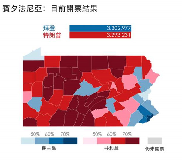 賓夕法尼亞州、威斯康星州和密歇根州成為關鍵。目前看來上述三州今天都不會有結果。其中賓夕法尼亞州進展最慢,預估將點票需時數日。