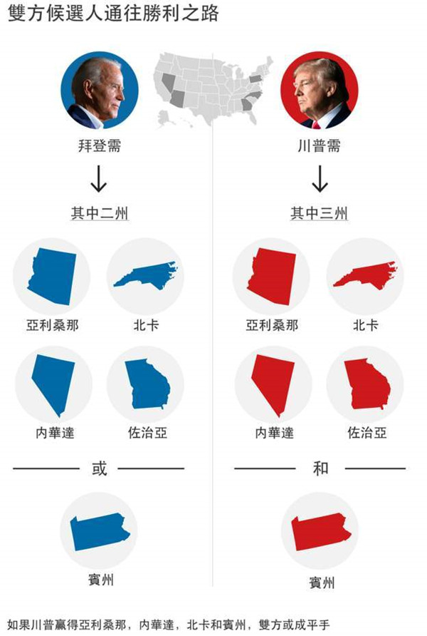 目前拜登以253张选举人票领先特朗普的214票。获胜所需的票数是270。胜选一方必须要拿下哪些州份: