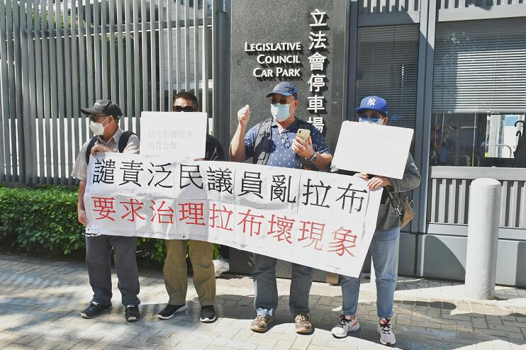 多個團體及市民今日(4日)到立法會外請願,抗議反對派議員狂點人數亂「拉布」,阻撓審議法案及癱瘓立法會。並促請立法會主席梁君彥果斷剪布,及行使主持會議權力,對濫用點算法定人數和重複發言多加勸止及禁言。