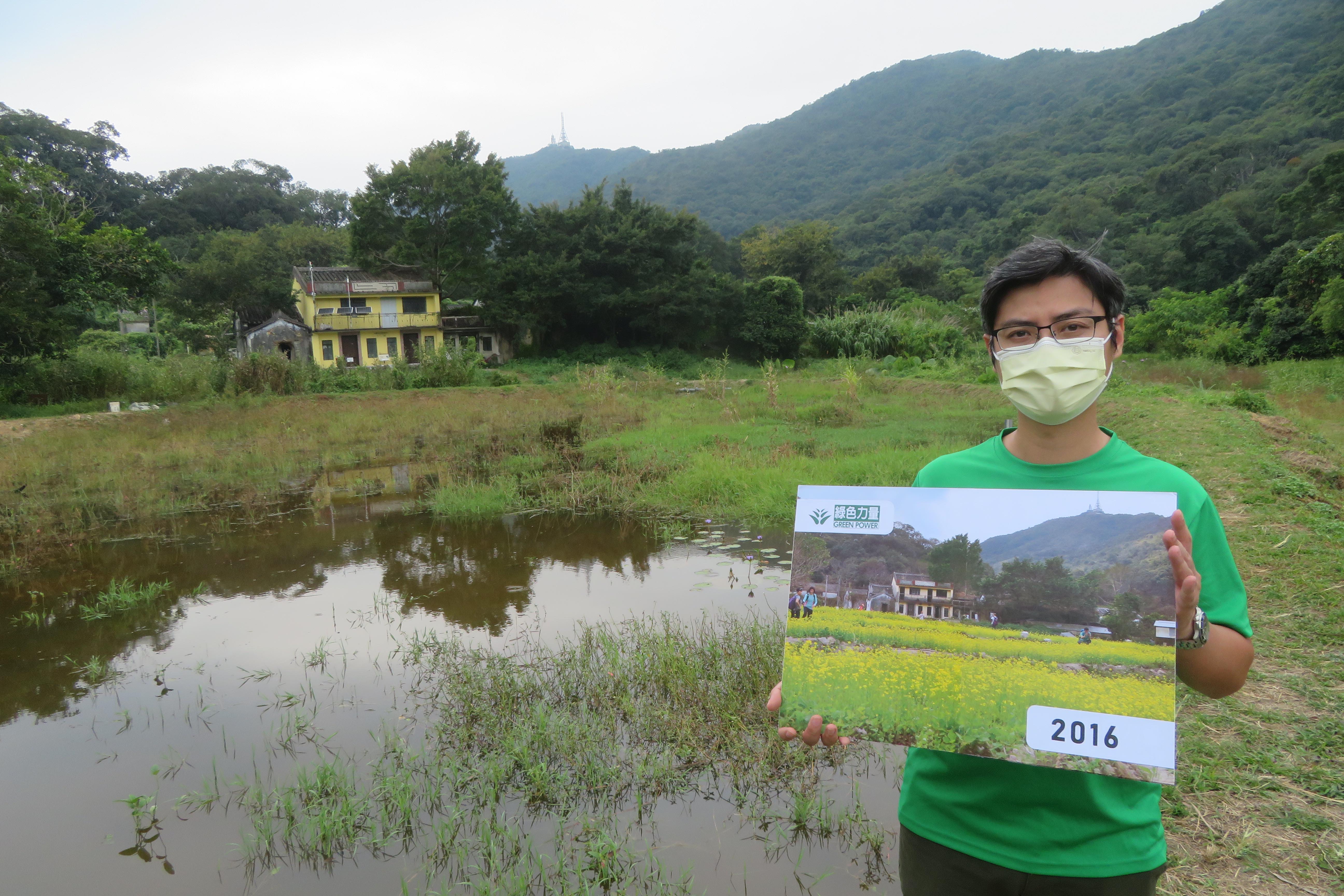 單家驊身後是現時的生態池塘,他所持圖片顯示2016年時池塘被倒進廢料之後種植旱地植物油菜花。