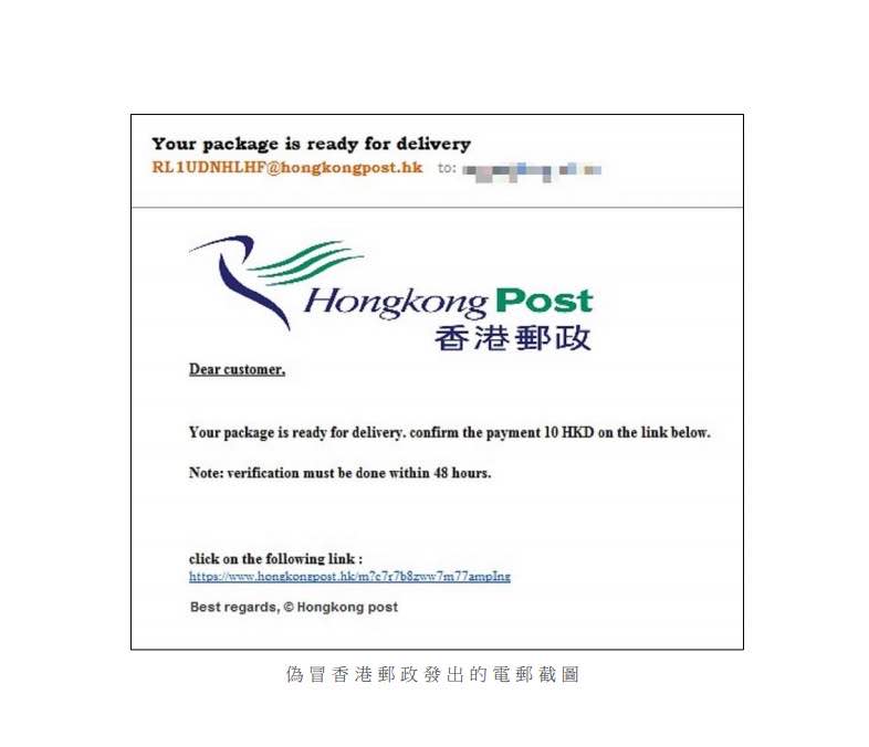 香港郵政今日(4日)提醒市民保持警覺,慎防有人冒認香港郵政發出電郵要求收件人繳付郵件派遞費用。香港郵政發言人表示,香港郵政不會透過電郵要求收件人繳付郵件派遞費用。近日發現附件所示有香港郵政名稱及標誌的電郵並非由本署發出,市民切勿點擊任何可疑電郵的連結,或向其連結網頁提供任何個人及/或信用卡資料,或繳交任何款項。香港郵政已就該等偽冒電郵向警方報案,以作調查。