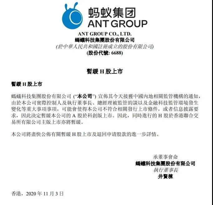 官方說法是,由於螞蟻實際控制人馬雲、董事長井賢棟和首席執行官胡曉明被有關部門聯合進行監管約談,而螞蟻也報告了所處的金融科技監管環境發生變化等重大事項,上交所認為,該重大事項可能導致螞蟻不符合發行上市條件或訊息披露要求,故根據有關法規並征詢保薦機構的意見,決定暫緩螞蟻上市。暫緩A股上市後,螞蟻也宣布,連同H股的上市計劃也會暫緩。