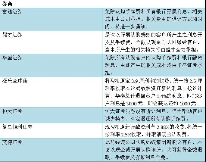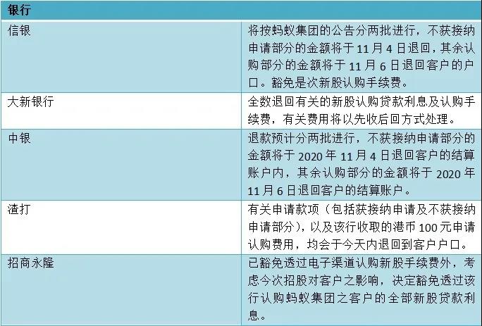 雖然上市失敗,投資者失落之餘,還是更關心什麼時候能拿回退款。螞蟻今天早上公布,H股上市認購款項會在今日及周五分兩批退款。證券界曾料孖展認購利息難以退款,富途等券商、銀行先後宣布免手續費及融資利息,但未確認免除方式,另外不少券商也將孖展利息調低或減少計息日數,這樣一來,券商銀行變相自掏荷包分擔利息支出,被贊有企業擔當。