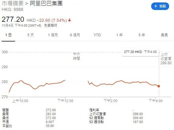 螞蟻上市被叫停,今日的股市也表現不佳,表現最差的藍籌股當然是阿里巴巴,阿里今日股價低開9.2%,低見272元,收市報277.2元,跌幅收窄至7.5%。競爭對手騰訊(700)亦受其拖累,跌1.6%,收報588.5元,兩只股份合共拖低港股145點。