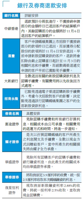 中銀香港(2388)與中信銀行(國際)均將按螞蟻集團的公告分兩批進行,不獲接納申請部分的金額4日已退回,其餘認購部分的金額將於周五(6日)退回客戶的戶口。
