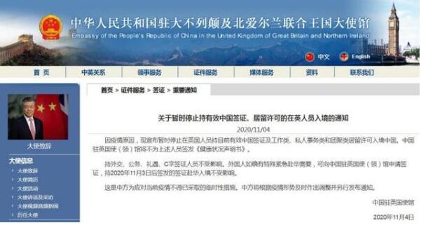 據中國駐英國大使館網站4日消息,因疫情原因,中國駐英國大使館宣布暫時停止在英國人員持目前有效中國簽證及工作類、私人事務類和團聚類居留許可入境中國。中國駐英國使(領)館將不為上述人員簽發《健康狀況聲明書》。