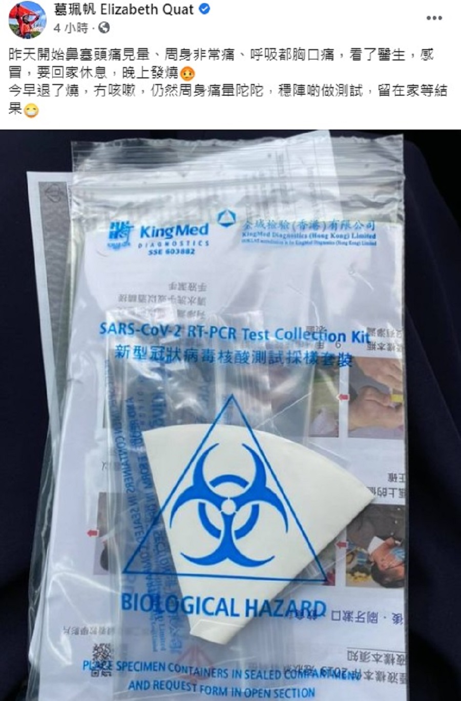 葛珮帆指,今早已退燒,沒有再咳嗽,但依然「周身痛暈陀陀」,故要「穩陣啲」做病毒測試。