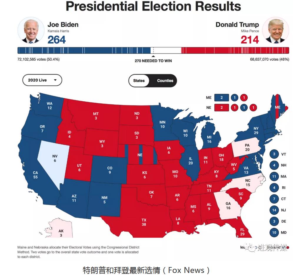 正如不少媒体預測的那樣,「特朗普基本輸定了」。最新數據顯示,拜登已拿下264張選舉人票,再來6張即可邁過法定的270張獲勝門檻。例如他目前領先的內華達州就有6張票,一旦到手就不用考慮其他州了。而他的對手目前的票數只有214張。盡管一些搖擺州的計票工作仍在緊張進行,特別是賓州等有大量郵寄選票的州,選情仍在變化中,但目前這些州雙方各佔的優勢差距並不大,所以對特朗普來說,要再取56張票的難度顯然大大高於拜登。