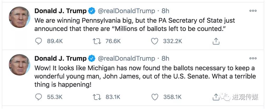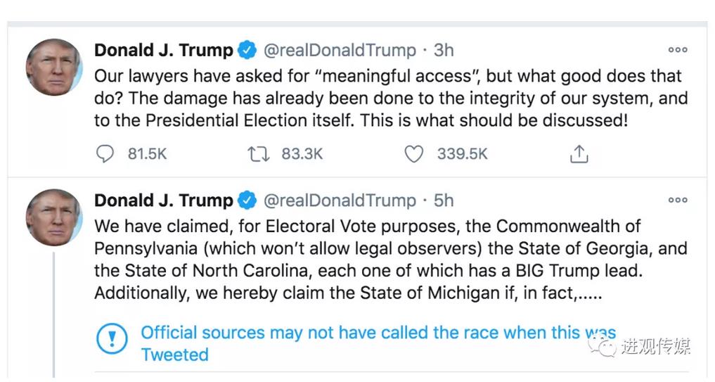 從特朗普的最新推特也可看出,他對獲勝的信心已經不像昨晚(北京時間,以下除標明者外,都用北京時間)那麼十足了,昨晚他的演講與獲勝感言幾乎沒啥區別。此刻(下午3點)正值美國深夜,特朗普大概在睡覺了,七八十歲的老人,不能再24小時連軸轉了。今晨3點,他連發兩推,仍在宣布自己在搖擺州可能獲勝,但語氣已不像昨晚那麼堅決。其中一條說:「我們正在贏得賓州,但賓州官方卻宣稱還有幾百萬選票尚未統計。」淩晨5點,他發推說:「我已經從選票角度宣布過,賓州、佐治亞州和北卡羅萊納州這三個州,每個都是特朗普遙遙領先。此外,我還要在這裏宣布,密歇根州事實上也……」他的話沒說完,被推特管理者截斷了,並被附上一條带驚歎號的注釋:「這條推特發布時,官方渠道並未宣布競爭結果。」截至筆者撰文時他發的最後一條原創推特是:「我們的律师正在研究『有效途徑』,看怎樣才能做得更好。針對我們的體制所造成的傷害已經形成,這也傷及總統大選本身。這是必須要加以討論的!」看見沒有,這已不像是一位將要獲勝者的口吻。和很多人猜測的一樣,他要拿起法律武器,走興訟之路了。