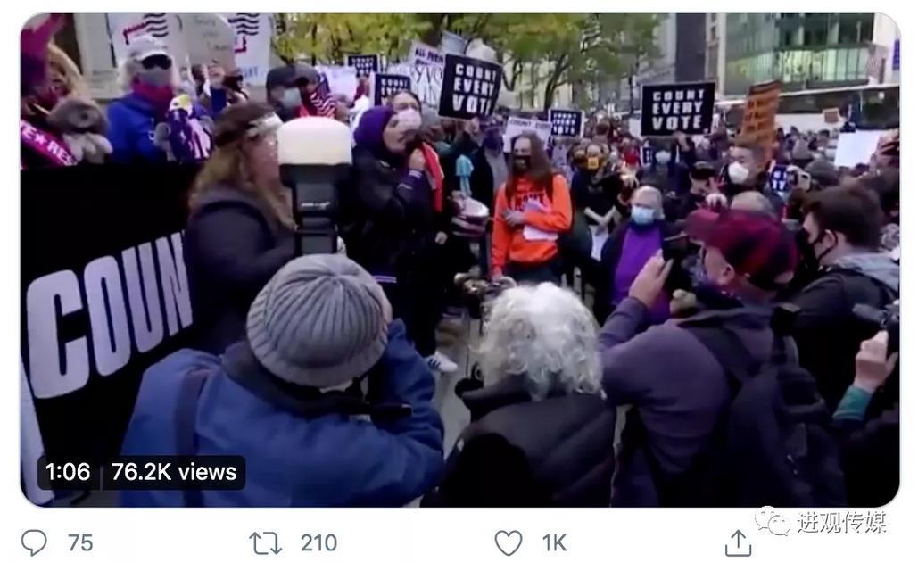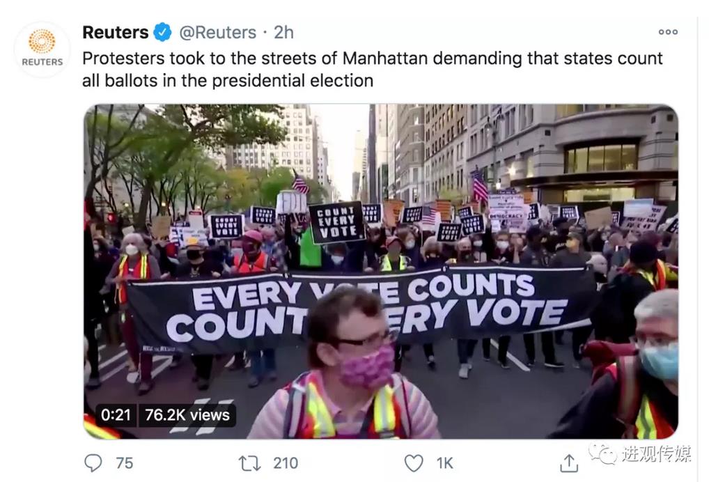 另一方面,一些地方已經上街遊行。據路透社今天上午9點通過推特發布的視頻報道,紐約曼哈頓已有大批抗議者聚集示威,要求紐約州政府清點每一張選票。但正如該報道後面一位留言者所質疑的那樣:難道選票不是每張被清點嗎?不清點哪來的計票結果?這位留言者勸那些抗議者別被錯誤信息誤導。可是從被採訪的示威者的表態看,他們確實有這個擔憂,因為目前確實包括紐約州在內的大多數州的選票並未完全計出,只不過根據多數票決定選舉票歸屬的規定,只要已經統計的選票達到多數比例,即可宣布某個候選人在該州獲勝。他們擔心剩下的選票就不計了(因為沒有意義)。但抗議者希望繼續統計(我估計也會繼續統計的),以見證雙方實際票數。何況特朗普團隊正在要求一些州停止計票。一位被採訪者說:「我投了一票,我有權看到我這一票的歸屬。」一些抗議者很激動,美國民眾的民主精神真是融在血液里的。