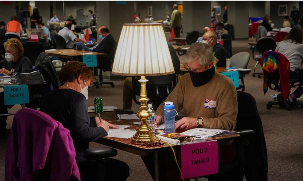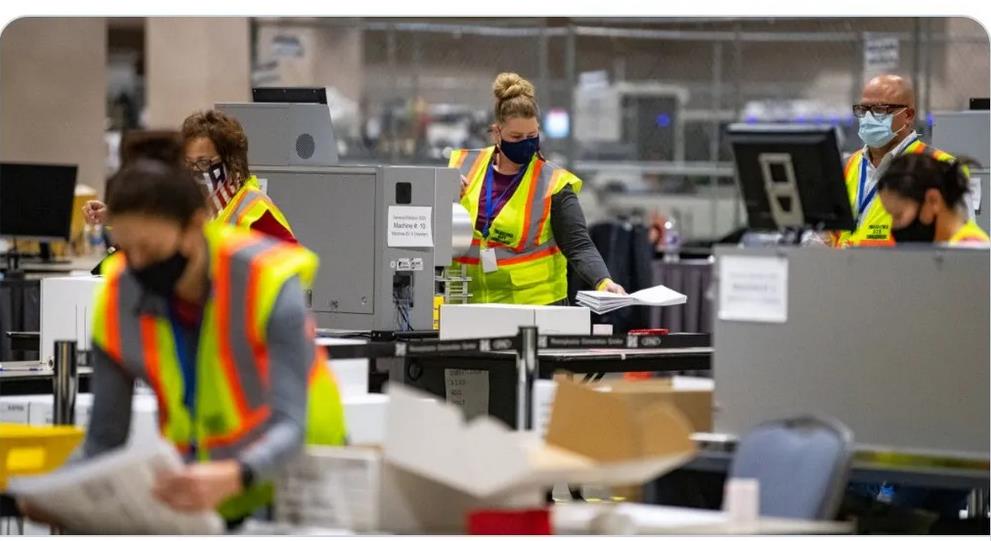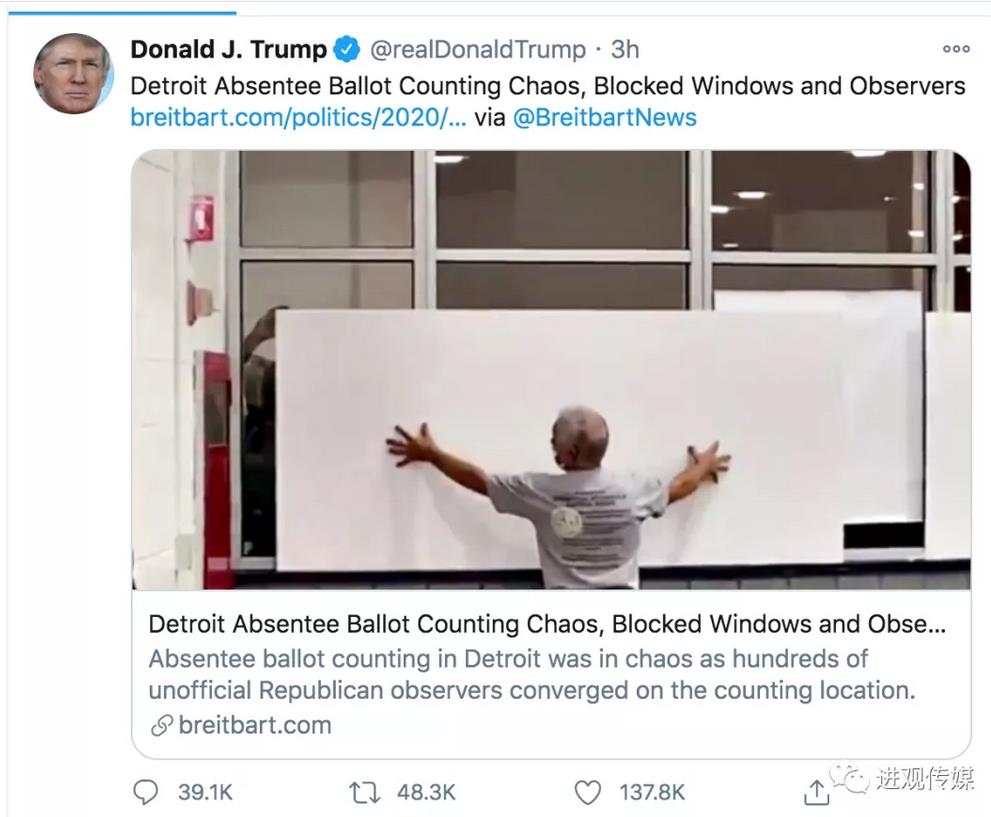 特朗普轉發關於底特律工作人員因郵寄選票混亂而遮擋玻璃窗(推特截圖)