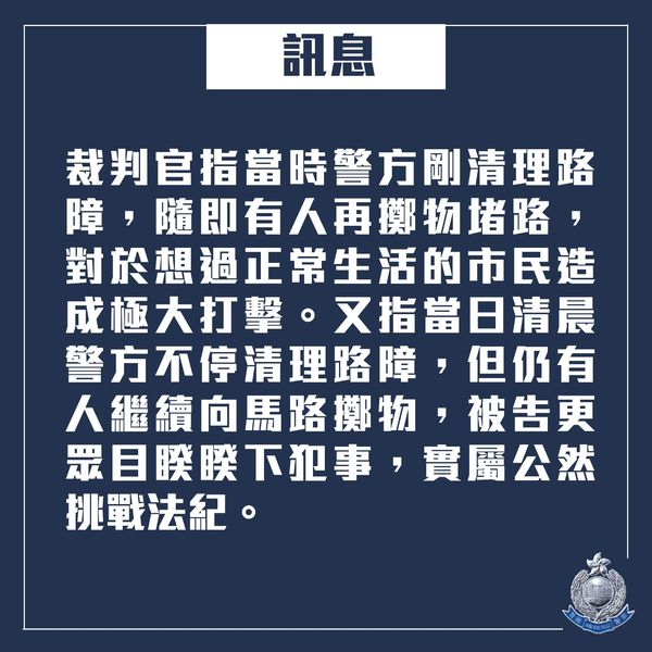 警方亦列出裁判官的判詞,內容指裁判官認為被告犯案對於想過正常生活的市民造成極大打擊,故須即時判監。(記者 唐信恆)