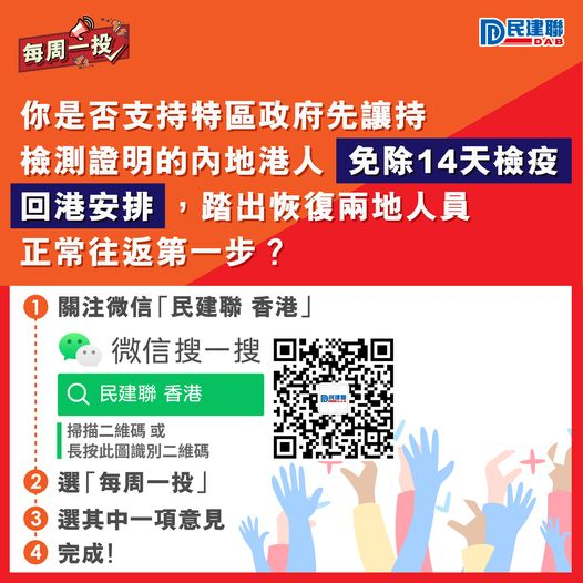 民建聯在社交平台發文,詢問市民是否支持政府先讓持檢測證明的內地港人免除14天檢疫回港安排,以踏出恢復兩地人員正常往返的第一步。民建聯指市民可立即關注「民建聯 香港」微信公眾號,然後點選「每周一投」去參與投票並發表意見。(記者 唐信恆)