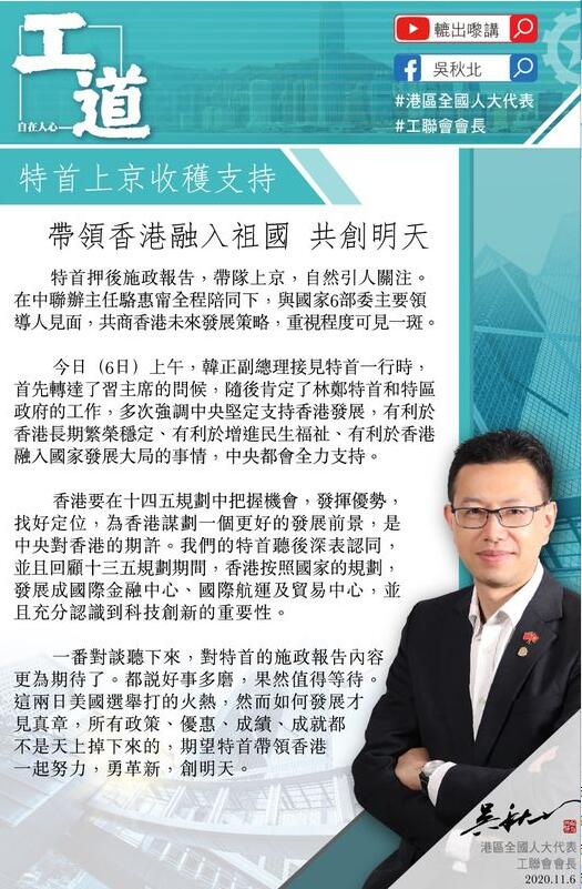工聯會會長吳秋北6日在社交網站發表題為「帶領香港融入祖國 共創明天」的文章,他在文中表示,國務院副總理韓正會見行政長官林鄭月娥,充分肯定特首和特區政府的工作,並多次強調中央堅定支持香港發展,凡是有利於保持香港長期繁榮穩定、有利於增進香港百姓民生福祉、有利於香港融入國家發展大局的事情,中央都會全力支持。特首聽後深表認同,並且回顧「十三五」規劃期間,香港按照國家規劃,發展成國際金融中心、國際航運及貿易中心,並且充分認識到科技創新的重要性。