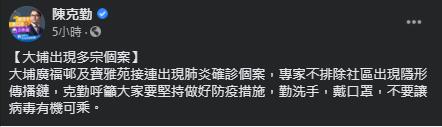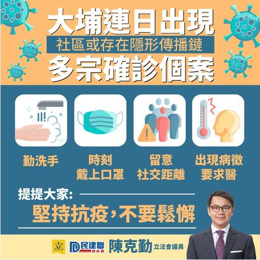 民建聯立法會議員陳克勤在社交平台表示,大埔區內兩屋苑接連出現新型肺炎確診個案,而專家亦不排除社區出現隱性傳播鏈,因此他呼籲市民做好防疫措施,避免病毒有機可乘。