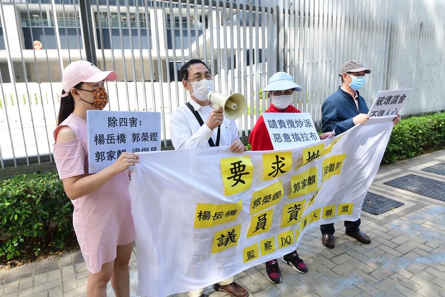 其他到場團體包括:香港青年關注組、監察DQ議員大聯盟、市民反拉布關注組,他們均要求立法會主席行使發揮議會權力,果斷剪布,以及嚴懲拉布的反對派議員,撒消楊岳橋、郭榮鏗、梁繼昌及郭家麒4人議員資格。(記者馮偉強 崔俊良攝)