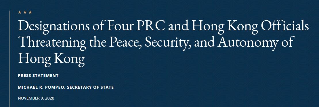 今年8月至今,美國以國安法為借口,已宣布「制裁」10名內地及香港現任前任官員,包括行政長官林鄭月娥、港澳辦主任夏寶龍及中聯辦主任駱惠寧等。