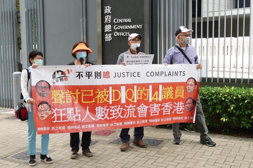 另有團體「不平則鳴」今日到政府总部外請願,譴責反對派狂點人數,虛耗議會時間,並批評郭榮鏗、楊岳橋、郭家麒、梁繼昌4人,要求有關部門取消他们議員資格。