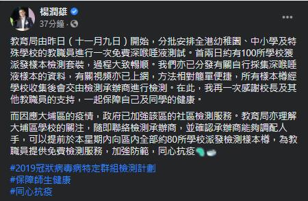 楊潤雄在社交專頁facebook發文表示,昨日起分批安排全港幼稚園、中小學及特殊學校的教職員進行一次免費深喉唾液測試,教育局已分發有關自行採集深喉唾液樣本的資料,及上載有關視頻到網上,指方法相對簡單便捷,所有樣本樽經學校收集後會交由檢測承辦商進行檢測。他又感謝校長及其他教職員的支持,一起保障自己及同學的健康。