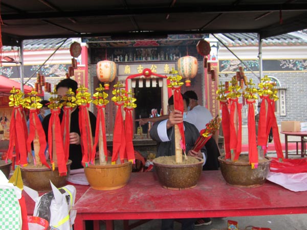 10月29日早上躉符儀式前,村民在車公古廟門前的祭壇備上香燭水果三牲祭品(包括兩隻大燒豬)。車公廟左旁除搭了一個道壇外,還豎立一座鎮懾惡煞、孤魂野鬼的大士王。躉符法事當然少不了主角躉符,喃嘸師傅忙於在五個盛滿沙粒的瓦盆插上繫有紅繩紅布和金銀葉的竹符。