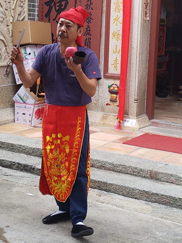 陳師傅頭繫紅帶,一手揮舞師刀收煞,一手吹響牛角招將為符賜力量。