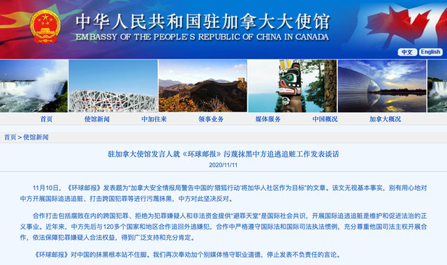 據中國駐加拿大使館網站消息,11月10日,《環球郵報》發表題為「加拿大安全情報局警告中國的『獵狐行動』將加華人社區作為目標」的文章。該文無視基本事實,別有用心地對中方開展國際追逃追贓、打擊跨國犯罪等進行污衊抹黑,中方對此堅決反對。