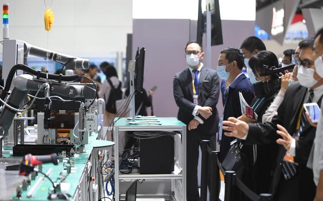 11月6日,在第三屆進博會技術裝備展區,人們在西門子展台觀看人機協作的智能化單元生產線。 新華社