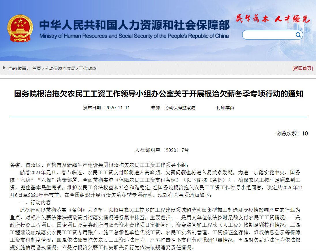 據人社部官方網站消息顯示,國務院根治拖欠農民工工資工作領導小組辦公室日前印發《關於開展根治欠薪冬季專項行動的通知》,決定從2020年11月6日至2021年春節前,在全國組織開展根治欠薪冬季專項行動。