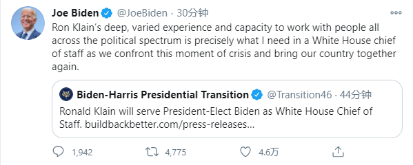 12日,美國「當選總統」拜登發推表示:「羅恩•克萊因具有的與所有政治派別人士合作的深厚而豐富的經驗與能力,正是我們在面對這一危機時刻以及讓我們的國家重新團結起來時,我所需要的白宮辦公室主任(應具備的)。」