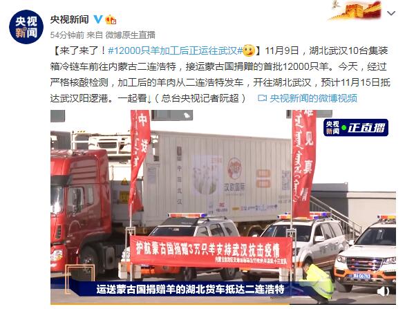 據央視新聞報道,11月9日,湖北武漢10台集裝箱冷鏈車前往內蒙古二連浩特,接運蒙古國捐贈的首批12000隻羊。今日,經過嚴格核酸檢測,加工後的羊肉從二連浩特發車,開往湖北武漢,預計11月15日抵達武漢陽邏港。
