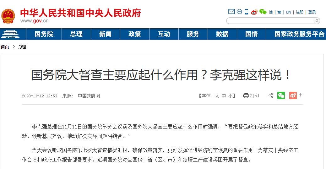 中國政府網今日刊文透露,李克強總理在11月11日的國務院常務會議談及國務院大督查主要應起什麼作用時強調:「要把督促政策落實和總結地方經驗、傾聽基層建議、推動解決實際問題相結合。」