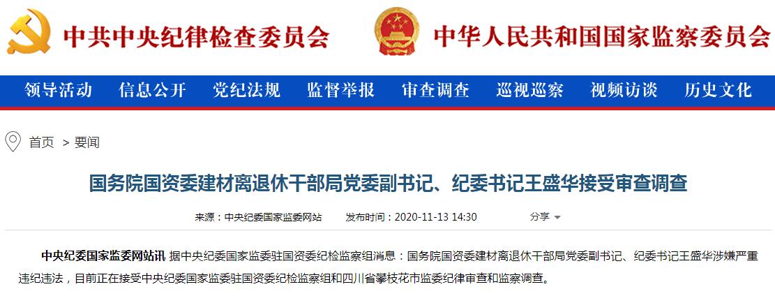 據中央紀委國家監委駐國資委紀檢監察組消息,國務院國資委建材離退休幹部局黨委副書記、紀委書記王盛華涉嫌嚴重違紀違法,目前正在接受中央紀委國家監委駐國資委紀檢監察組和四川省攀枝花市監委紀律審查和監察調查。